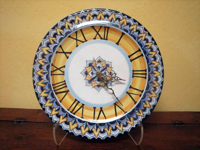 Clock, blue and yellow design $230 Decorated with a geometrical design, this clock will be a great addition to your kitchen. Battery operated (battery included). This clock is hand thrown. 13. 5"W |